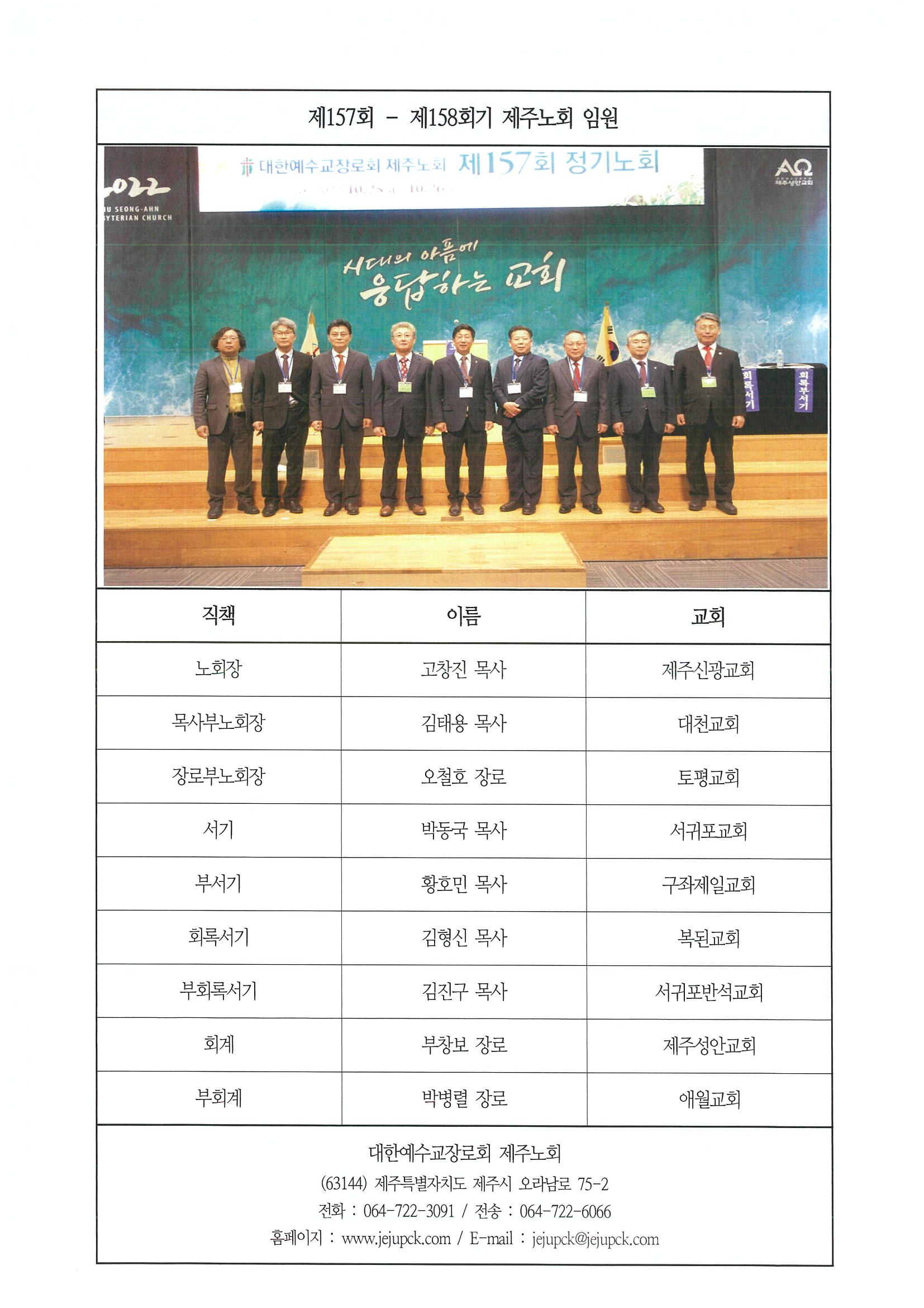 노회장 김태영 장로 제주성산교회 부노회장 황호민 목사 구좌제일교회 부노회장 박병렬 장로 애월교회 서기 김형신 목사 복된교회 부서기 김진구 목사 서귀포반석교회 회록서기 류승선 목사 노형중앙교회 부회록서기 문태국 목사 무릉교회 회계 신상진 장로 신촌교회 부회계 이동일 장로 제주영락교회 프린트